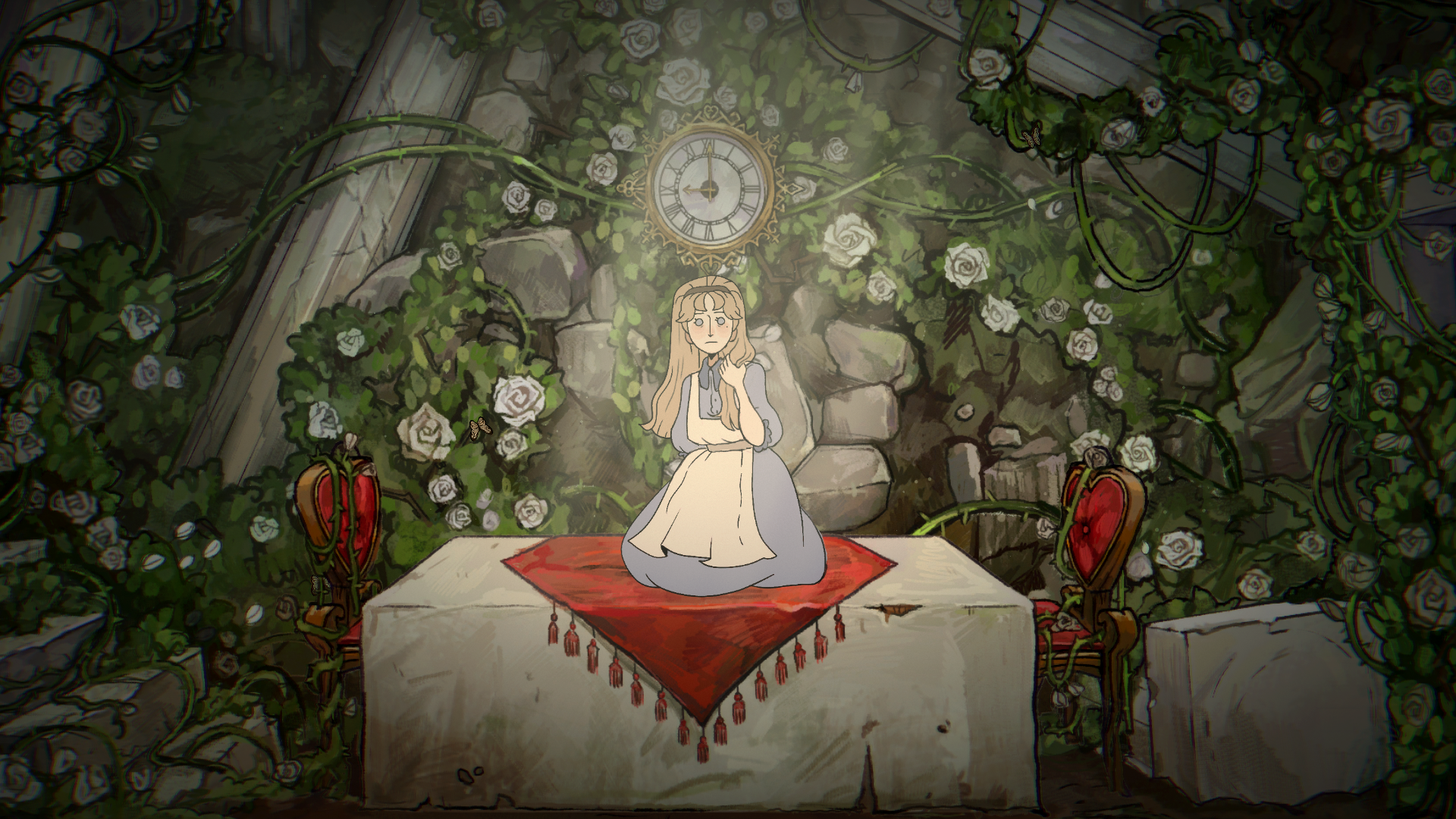 Długi upadek Alicji kończy się na stole zasłanym zniszczonym obrusem i czerwoną serwetą. W tle zdewastowane kolumny i całe morze krzewów z pąkami białych róż. Sceneria jest romantyczna, choć lekko niepokojąca, a główna bohaterka zastanawia się, jakim cudem przeżyła kilometrowy lot w przepaść. Boli ją głowa i na różne sposoby próbuje się przebudzić, póki nie uświadamia sobie, że nie znajduje się we śnie. Po krótkiej eksploracji Alicja podnosi nożyce i przecina nimi pnącza - gęstą siecią porastają przejście do bardziej otwartej części ruin, gdzie za chwilę natknie się na szkielet z eleganckim pierścieniem i pusty dziennik. Decyzja o przywłaszczeniu pierścienia należy do gracza, jednak niezapisany pamiętnik nastolatka bezdyskusyjnie zabiera ze sobą - od tego momentu będzie jej służyć do prowadzenia notatek o bieżących zadaniach i gryzmolenia po krawędziach kartek. Jedną z bardziej użytkowych funkcji dziennika jest możliwość zapisania stanu gry.