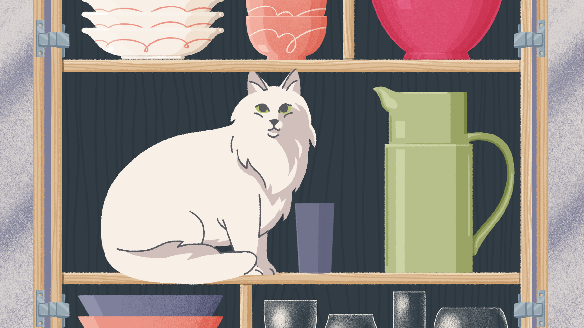 Poziomy dostępne w Cupboards & Drawers przeplecione są sympatycznymi scenkami z białym kotem. Zwierzę można znaleźć między innymi siedzące w kredensie pośród naczyń oraz wylegujące się w szufladzie, a pogłaskanie go w okolicy pyszczka oznacza przejście do następnej układanki.