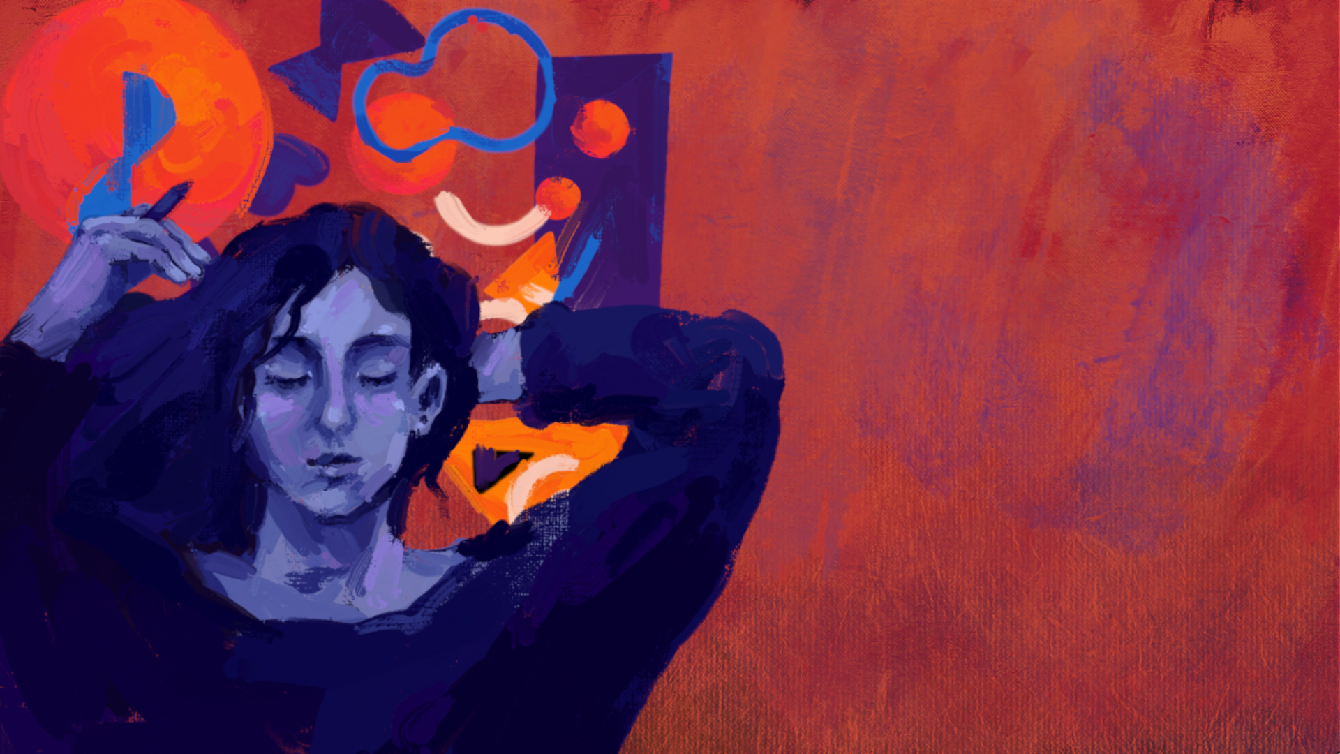 Młoda kobieta cierpi na bezsenność, a w jej głowie dosłownie rozgrywa się teatr dźwięków, kolorów i przeżyć, w którym uczestniczą zwierzęta, rzeczy znajdujące się w domu bohaterki oraz fragmenty tego, co ujrzała w mediach społecznościowych. To barwne przedstawienie reżyseruje mała skrzatka o niebieskich włosach - wdzięczne, ale jakże nieznośne ucieleśnienie bezsenności. Hałasuje i dokucza, nakręca wewnętrzny dialog, a twarz dziewczyny, w odpowiedzi na te ekscesy, wykrzywiają grymasy niezadowolenia.